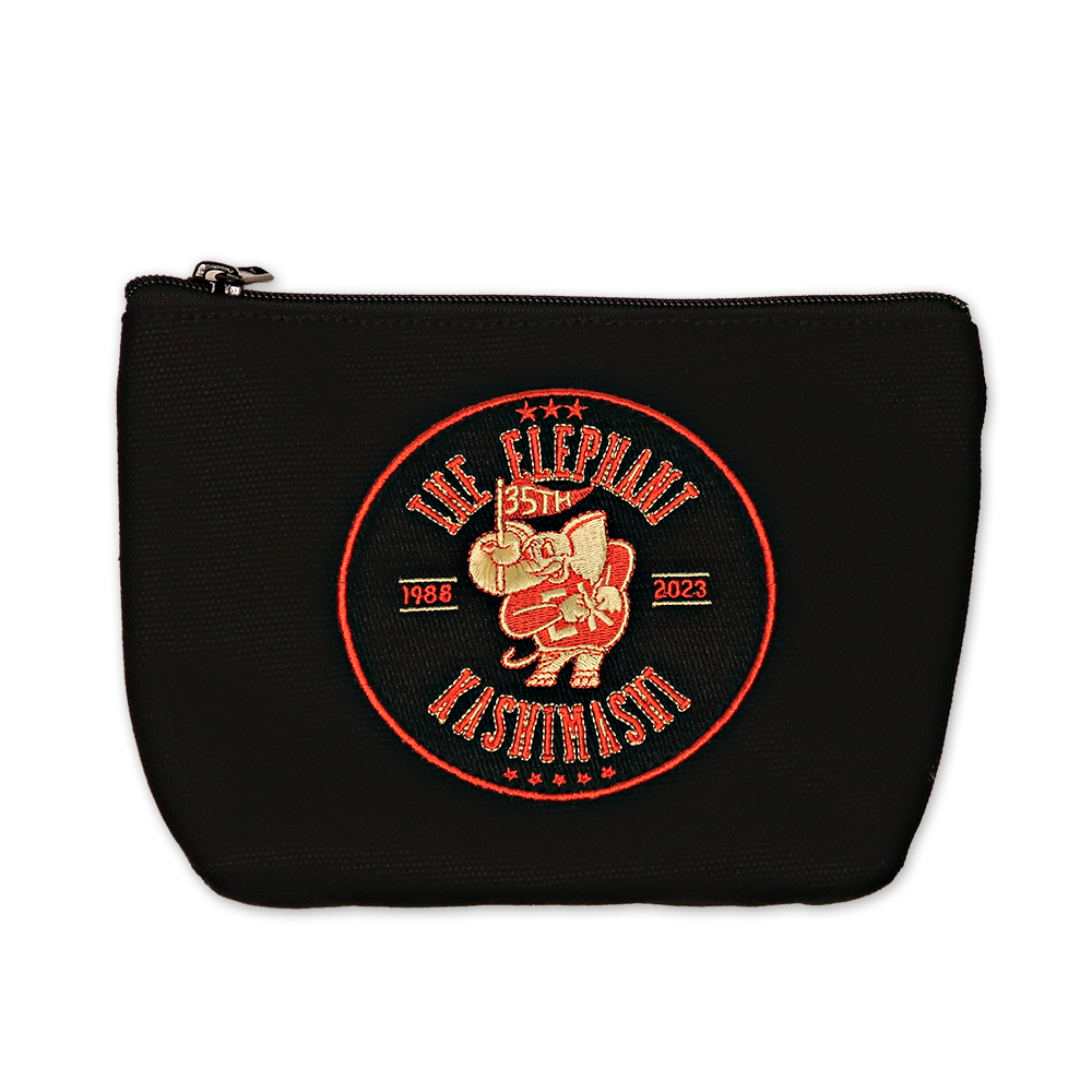 ゾウのイラスト入りの、カレッジ風デザインのワッペン付きポーチです。