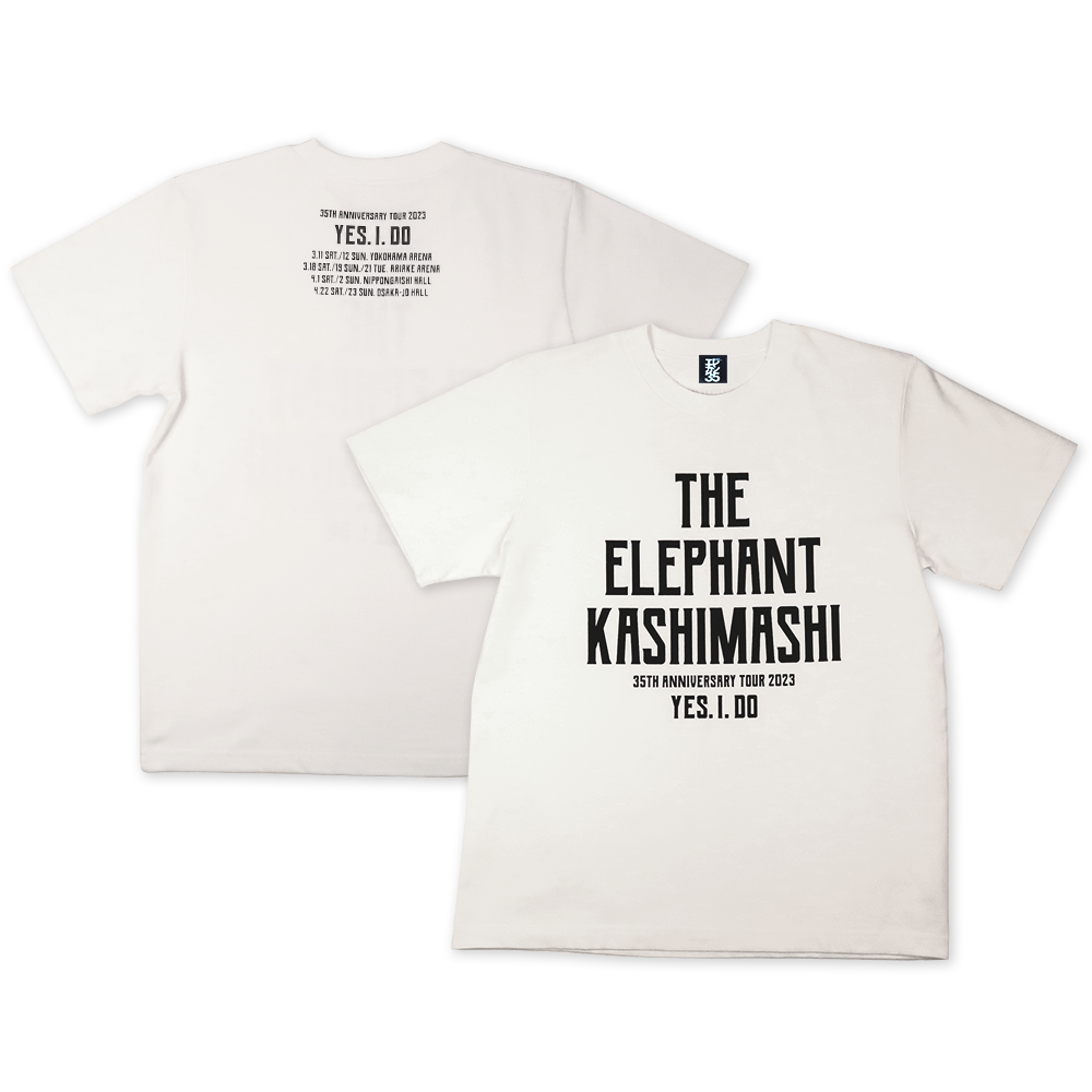 ゾウのイラストが目立つ、カレッジ風デザインのTシャツです。バックプリントには、 35th ANNIVERSARY TOUR 2023 YES. I. DOのツアースケジュールをデザインしました。