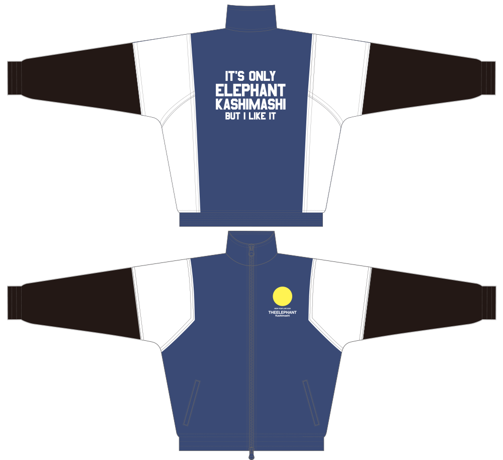 表面には、黄色い太陽と「THE ELEPHANT KASHIMASHI」の文字が、背面には「IT'S ONLY ELEPHANT KASHIMASHI BUT I LIKE IT」の文字がデザインされたブルゾンです。
