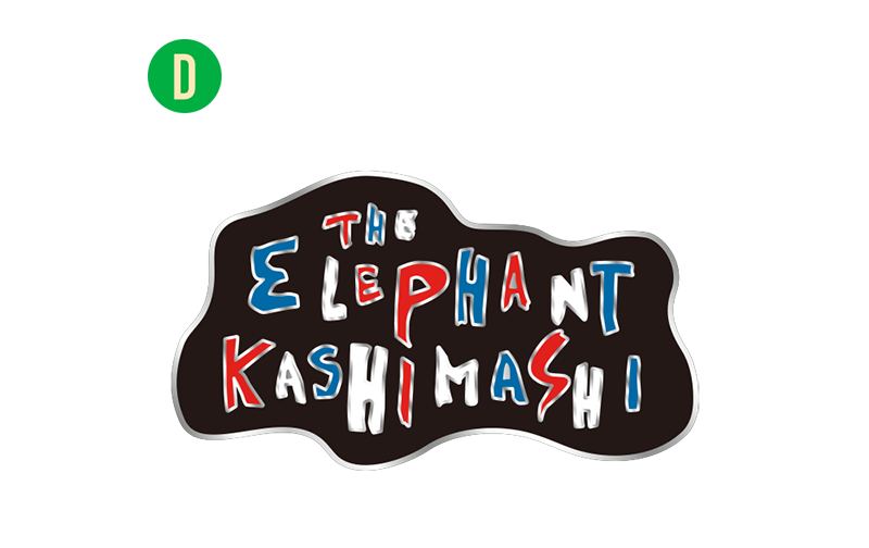 手書き文字でカラフルにデザインされた、「THE ELEPHANT KASHIMASHI」の文字がかわいいピンバッジです。