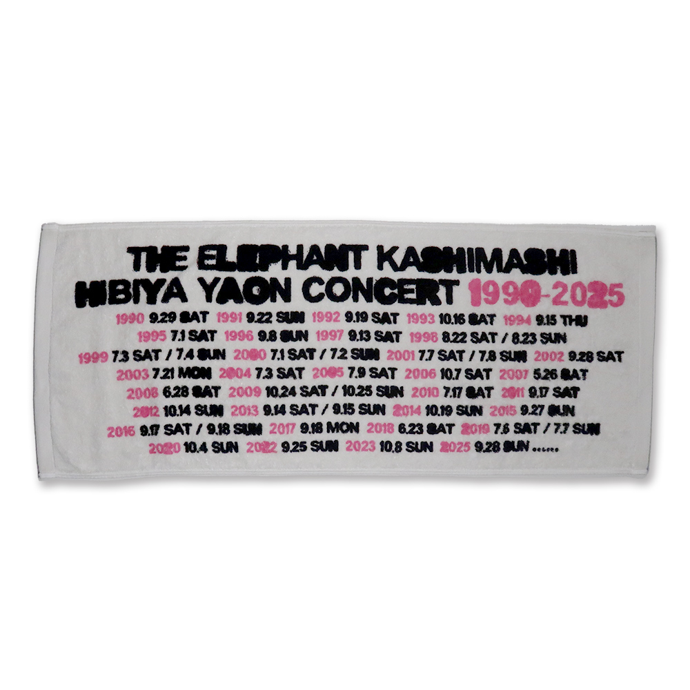 1990年以来35年の、エレファントカシマシの野音公演の日程をデザインしたタオル。落ち着いたグレー地に、ピンクの差し色が印象的です。