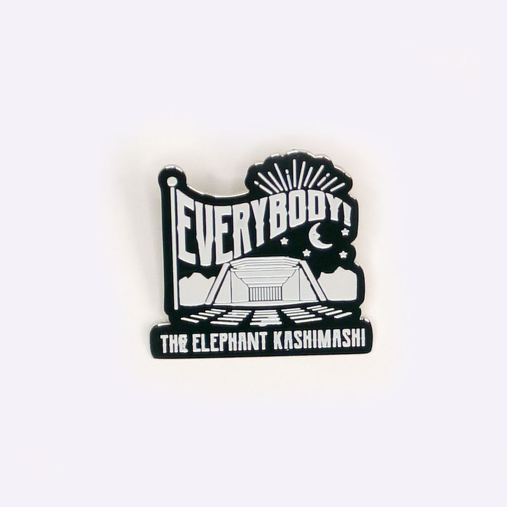 日比谷野外大音楽堂のステージと、フラッグ風の「EVERYBODY」の文字がデザインされたピンバッジです。