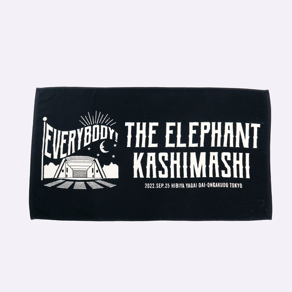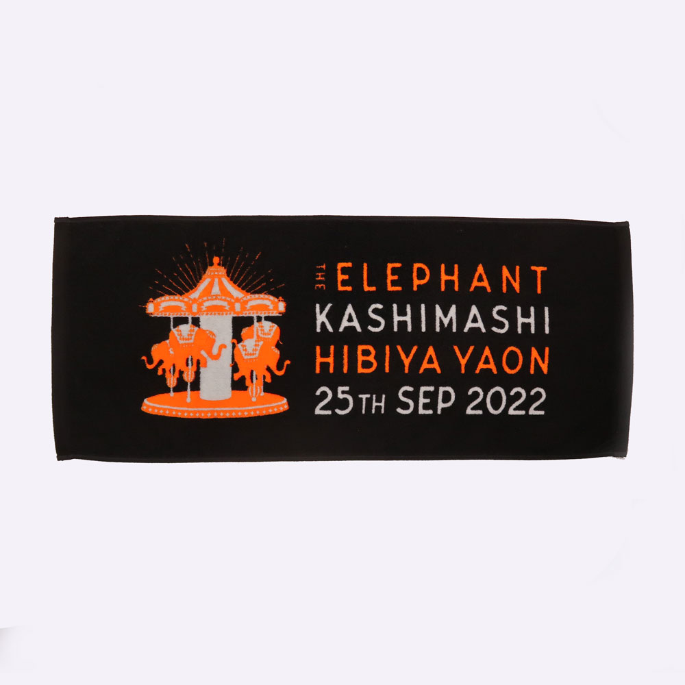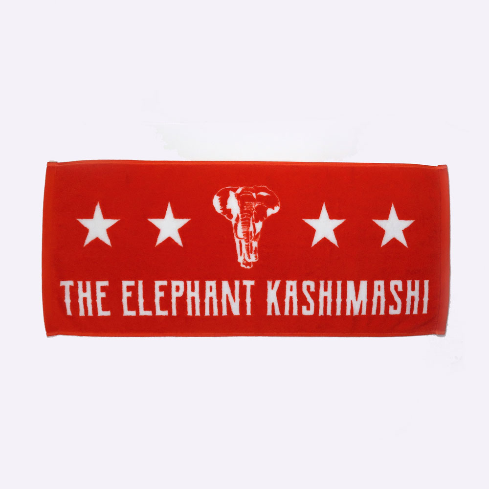 「THE ELEPAHANT KASHIMASHI」のバンド名が、象のイラストと共に書かれた、シンプルで力強いデザインの、赤が鮮やかなフェイスタオルです。